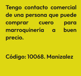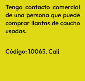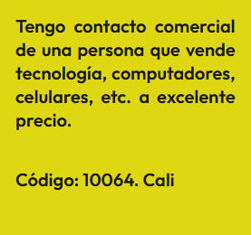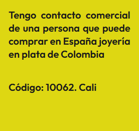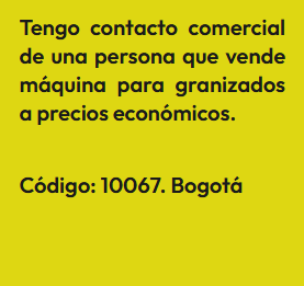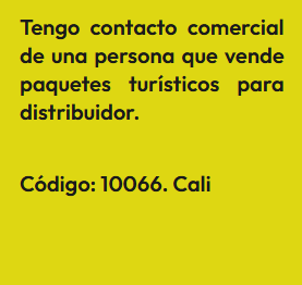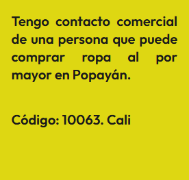 En esta sección encontrarás Anuncios de personas que tienen contactos comerciales, es decir que, conocen personas que pueden comprar o vender algún producto o servicio en masa, lo cual es importante para cualquier emprendimiento bien sea porque provee buenos precios o porque garantiza buenas ventas. En la sociedad que se forma las ganancias son en proporción al valor de lo aportado. El anuncio se identifica bajo un código, para proteger la identidad del Aportante. Por lo tanto, si estas interesado(a) en algún Aporte, debes registrarte e indicar el código que identifica el Aporte de tu interés y estará sujeta a aprobación por el Aportante. Así mismo, si deseas publicar un Aporte, ingresa a registro y diligencia el formulario respectivo.