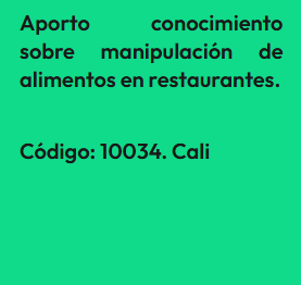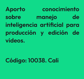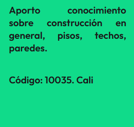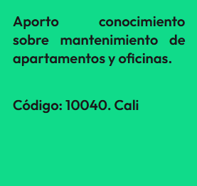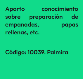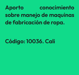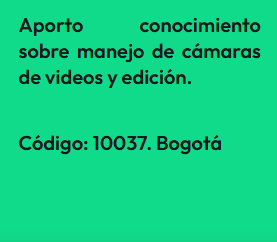 En esta sección encontrarás Aportes de habilidades, conocimientos, destrezas de personas que pueden interesar a alguien en su emprendimiento y conformar una sociedad compartiendo ganancias en proporción al valor de lo aportado. El anuncio se identifica bajo un código, para proteger la identidad del Aportante. Por lo tanto, si estas interesado(a) en algún Aporte, debes registrarte e indicar el código que identifica el Aporte de tu interés y estará sujeta a aprobación por el Aportante. Así mismo, si deseas publicar un Aporte, ingresa a registro y diligencia el formulario respectivo.