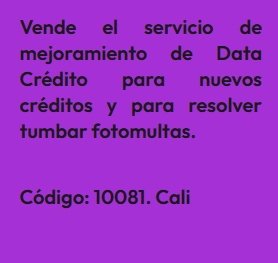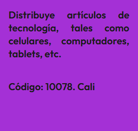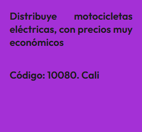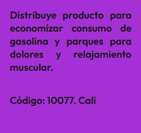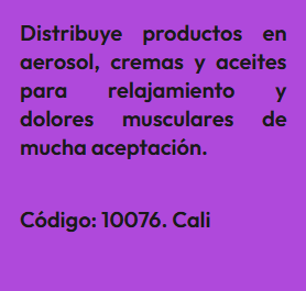 En esta sección encontrarás Anuncios de personas que ofrecen productos o servicios para quienes estén interesados en hacer emprendimiento como distribuidores. En este tipo de emprendimiento no se requieren sociedades, aunque, si se desea, se podría formar una sociedad con una persona que esté dispuesta a invertir en publicidad en redes sociales y las ganancias serían de acuerdo a las ventas efectuadas por esos medios. El anuncio se identifica bajo un código, para proteger la identidad del Aportante. Por lo tanto, si estas interesado(a) en algún Aporte, debes registrarte e indicar el código que identifica el Aporte de tu interés y estará sujeta a aprobación por el Aportante. Así mismo, si deseas publicar un Aporte de algún producto o servicio para que otros los distribuyan, ingresa a registro y diligencia el formulario respectivo.